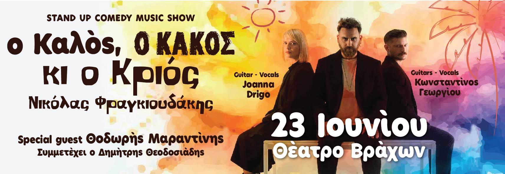 Kερδίστε διπλές προσκλήσεις για την stand up comedy music show «Ο Καλός, ο Κακός κι ο Κριός» του Νικόλα Φραγκιουδάκη στο Θέατρο Βράχων την Δευτέρα 23 Ιουνίου 2025 στις 21.30. Μαζί του η Joanna Drigo και ο Κωνσταντίνος Γεωργίου. Special guest ο Θοδωρής Μαραντίνης.