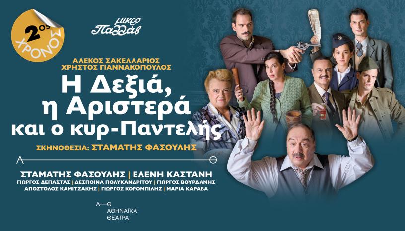 Με περισσότερους από 34.000 θεατές τον πρώτο χρόνο της παρουσίασής της στο κοινό, η σπαρταριστή κωμωδία «Η δεξιά, η αριστερά και ο κυρ-Παντελής» του Αλέκου Σακελλάριου και του Χρήστου Γιαννακόπουλου, που σκηνοθετεί και πρωταγωνιστεί ο Σταμάτης Φασουλής στο Μικρό Παλλάς, συνεχίζει ακάθεκτη για δεύτερη χρονιά!