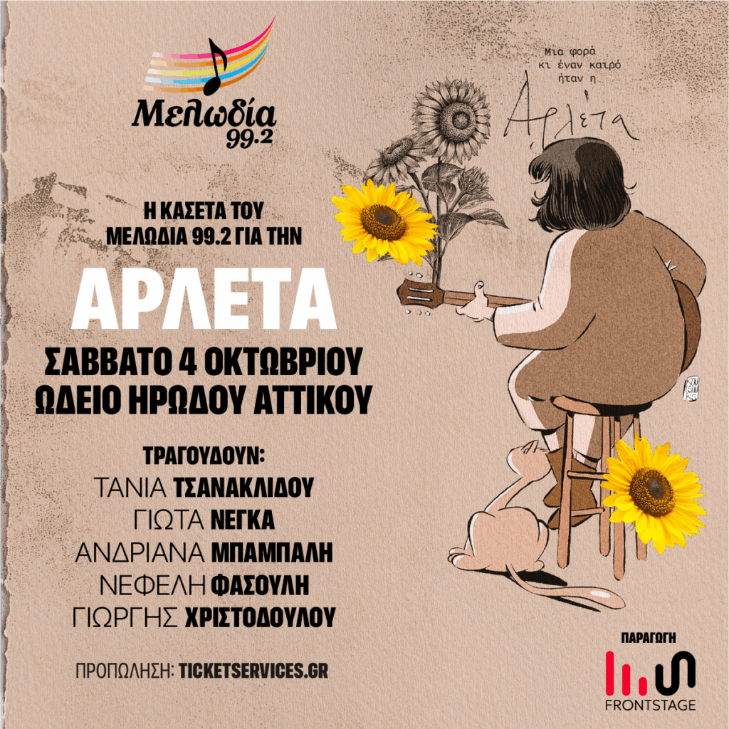 Ο Μελωδία 99.2 επιστρέφει το Σάββατο 4 Οκτωβρίου στο Ηρώδειο, με ένα διαφορετικό μουσικό παραμύθι για την Αρλέτα -τη φωνή που μας έμαθε τη δύναμη του ψιθύρου! Η Τάνια Τσανακλίδου, η Γιώτα Νέγκα, η Ανδριάνα Μπάμπαλη, η Νεφέλη Φασούλη και ο Γιώργης Χριστοδούλου, ενώνουν τις φωνές τους και την καλλιτεχνική ταυτότητα, για να δώσουν νέα πνοή στα τραγούδια που σφράγισε με τη φωνή και την παρουσία της η Αρλέτα. Πέντε καλλιτέχνες με διαφορετικές διαδρομές αλλά κοινή αγάπη για τον χαρακτήρα και την καλλιτεχνική ιδιοσυγκρασία της.Η πορεία της Αρλέτας ήταν χαμηλών τόνων, γεμάτη ειλικρίνεια, αυτοσαρκασμό και μουσική που δεν φώναξε ποτέ, αλλά πάντα ακουγόταν. Η ίδια ήταν μποέμ, ευφυής, σαρκαστική, τρυφερή και μία από τις πιο πολυσχιδείς και διακριτικές παρουσίες στο ελληνικό τραγούδι. Από το «Μια φορά θυμάμαι» και το «Μπαρ το Ναυάγιο» μέχρι τη «Σερενάτα», το «Τσάι Γιασεμιού» και τα «Ήσυχα Βράδια», τα τραγούδια της Αρλέτας ξαναζωντανεύουν με σεβασμό και συγκίνηση, σε μια παράσταση που ανασύρει στιγμές και εικόνες από τη ζωή και τη μουσική της πορεία.