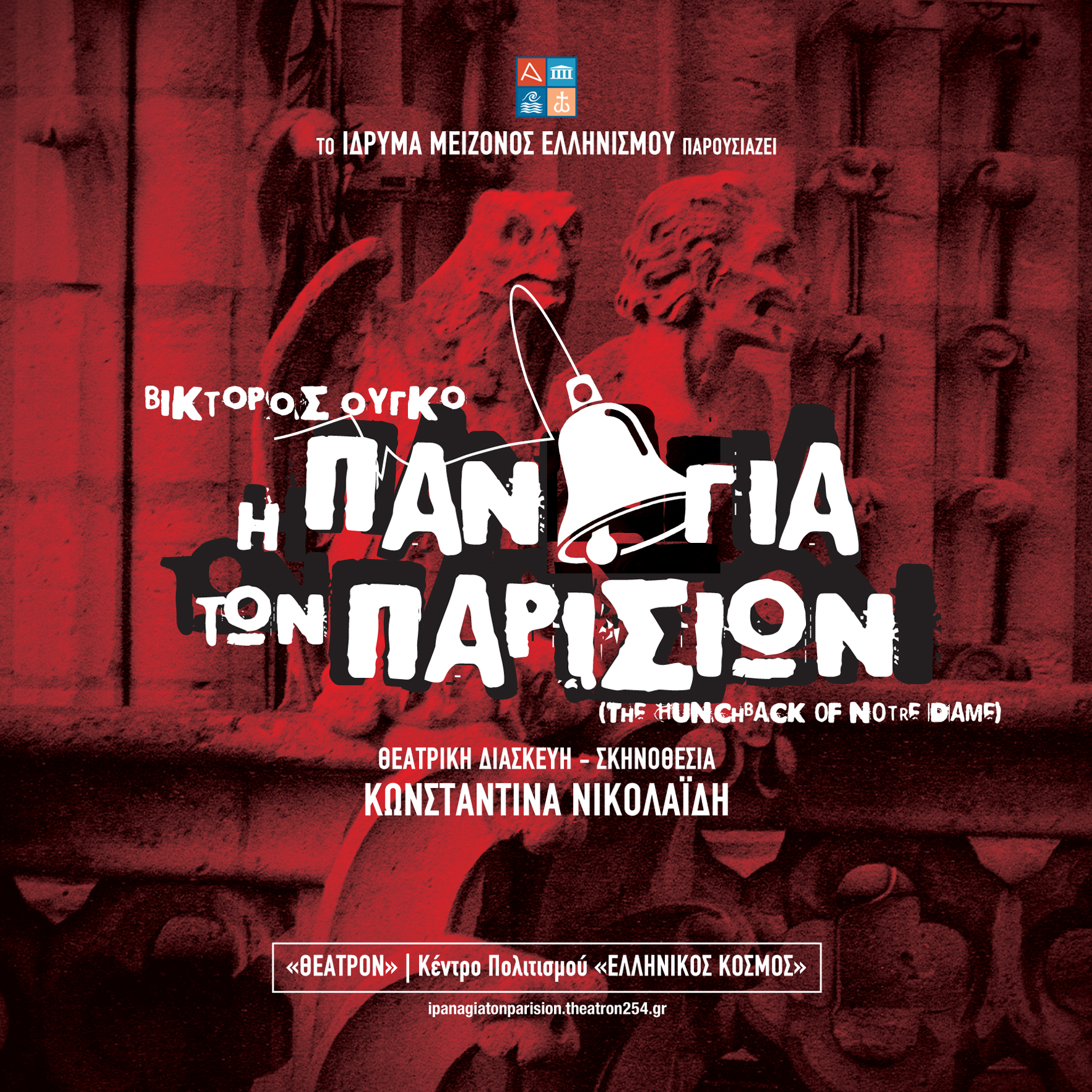 Το Ίδρυμα Μείζονος Ελληνισμού, με παράδοση στις υπερπαραγωγές βασισμένες στα σπουδαία έργα της παγκόσμιας λογοτεχνίας, παρουσιάζει τη θεατρική περίοδο 2025-2026 το κλασικό μυθιστόρημα, «Η Παναγία των Παρισίων», στο «Θέατρον» του Κέντρου Πολιτισμού «Ελληνικός Κόσμος». Μετά την τεράστια επιτυχία που σημείωσαν «Οι Άθλιοι» για δύο συνεχείς χρονιές, η Κωνσταντίνα Νικολαΐδη αναλαμβάνει τη σκηνοθεσία ενός ακόμα δημοφιλούς αριστουργήματος του μεγάλου Γάλλου συγγραφέα.