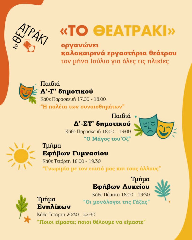 Οργανώνει καλοκαιρινά Θεατρικά Εργαστήρια για τον μήνα Ιούλιο για όλες τις ηλικίες!️ Στόχος μας η θεατρική εκπαίδευση σε συμπυκνωμένες δράσεις και συγκεκριμένες θεματικές.