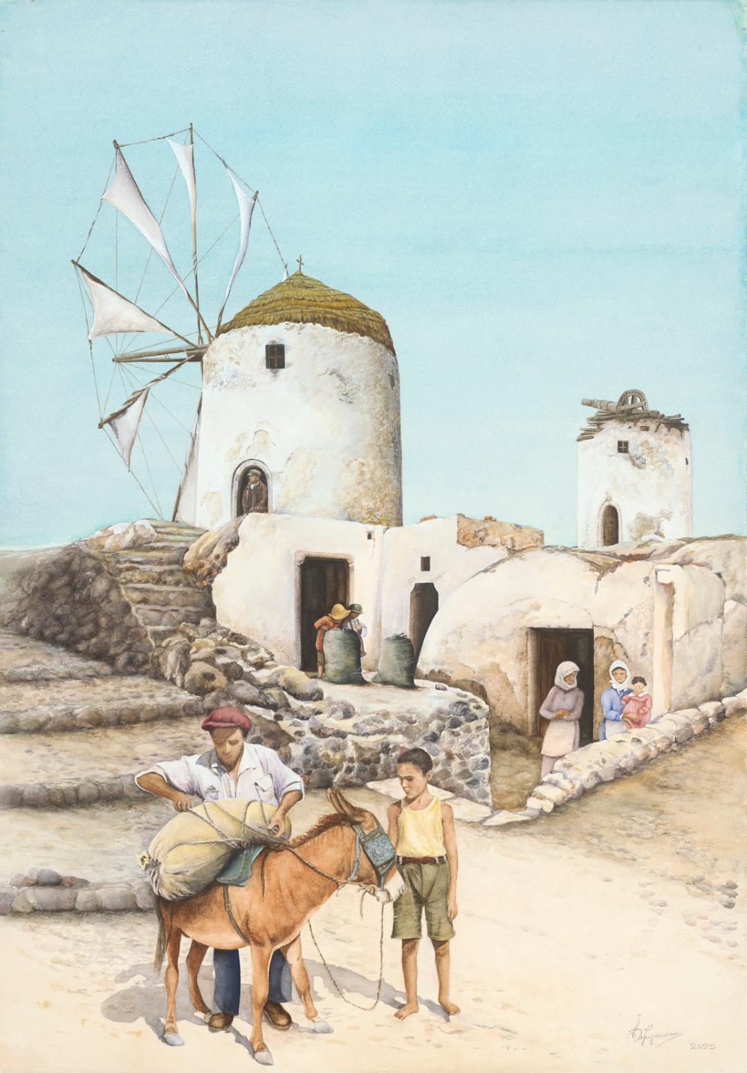 Με 15 έργα (όλα υδατογραφίες), η Άρτεμις Χατζηγιαννάκη ορίζει έναν τρόπο θέασης στον ορίζοντα της Σαντορίνης μέσα από τους τελετουργικούς κύκλους της παράδοσης, των κύκλων εργασίας, της τοπικής οικονομίας, των εθίμων και του συλλογικού θυμικού. Ο επισκέπτης θα αναγνωρίσει πτυχές μιας Σαντορίνης που επιβιώνει όχι μόνο στη μνήμη και στην προφορική μαρτυρία, αλλά και στο ανάγλυφο του τοπίου, στην αρχαία γη, στην γραμμή του ορίζοντα, στην παράδοση του οίνου και της αμπέλου, στα γεωργικά προϊόντα, στη χλωρίδα και στους κύκλους του χρόνου, στην αρχιτεκτονική, που διατρέχει τη στερεότυπη εικόνα της Σαντορίνης μέσα από εκλάμψεις αυθεντικότητας και αρχέγονης σοφίας.