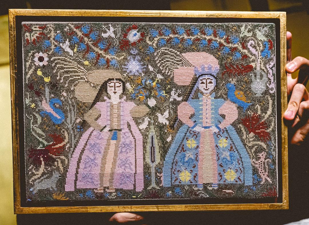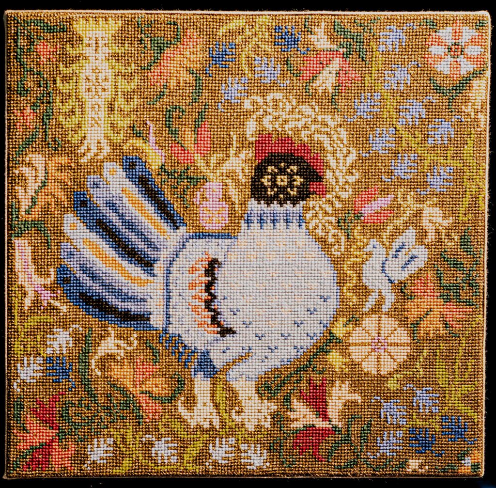 Η Διονυσία Παπαδοπούλου κεντά με πάθος αλλά και με απόλυτη συνείδηση της επιθυμίας και του προορισμού της βελόνας της, εδώ και περισσότερα από δέκα χρόνια. Ανθισμένοι κάμποι, πλοχμοί και πουλιά, πριγκίπισσες και έφιπποι, περίτεχνα φυτικά μοτίβα, σπείρες και ελλειπτικές φόρμες κεντημένες επίπονα με επιδέξια σταυροβελονιά και στιλπνά χρώματα, οργανώνουν περίτεχνα οπτικά πεδία και διασώζουν παλαιότερα αφηγήματα.