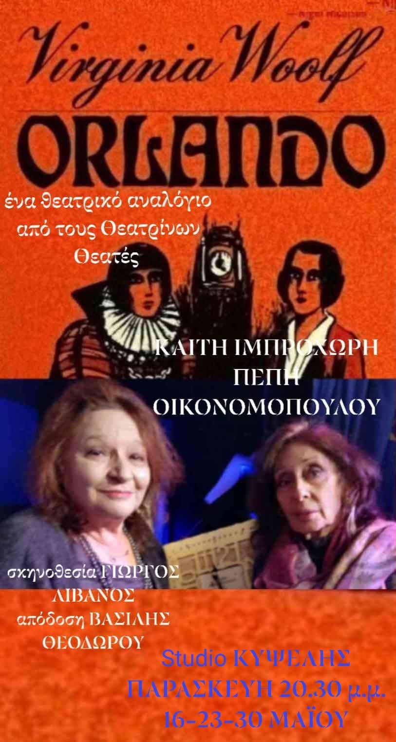 Οι ΘΕΑΤΡΙΝΩΝ ΘΕΑΤΕΣ  πιστοί στο ανοιξιάτικο ραντεβού θεατρικού αναλογίου, που έχει καθιερωθεί στο  STUDIO ΚΥΨΕΛΗΣ,  φέτος ενώνουν δύο κυρίες της ελληνικής θεατρικής σκηνής που  συναντούν  το περίφημο ΟΡΛΑΝΤΟ της ΒΙΡΤΖΙΝΙΑ ΓΟΥΛΦ. Την ΚΑΙΤΗ ΙΜΠΡΟΧΩΡΗ και την ΠΕΠΗ ΟΙΚΟΝΟΜΟΠΟΥΛΟΥ, βασικά στελέχη της ομάδας.