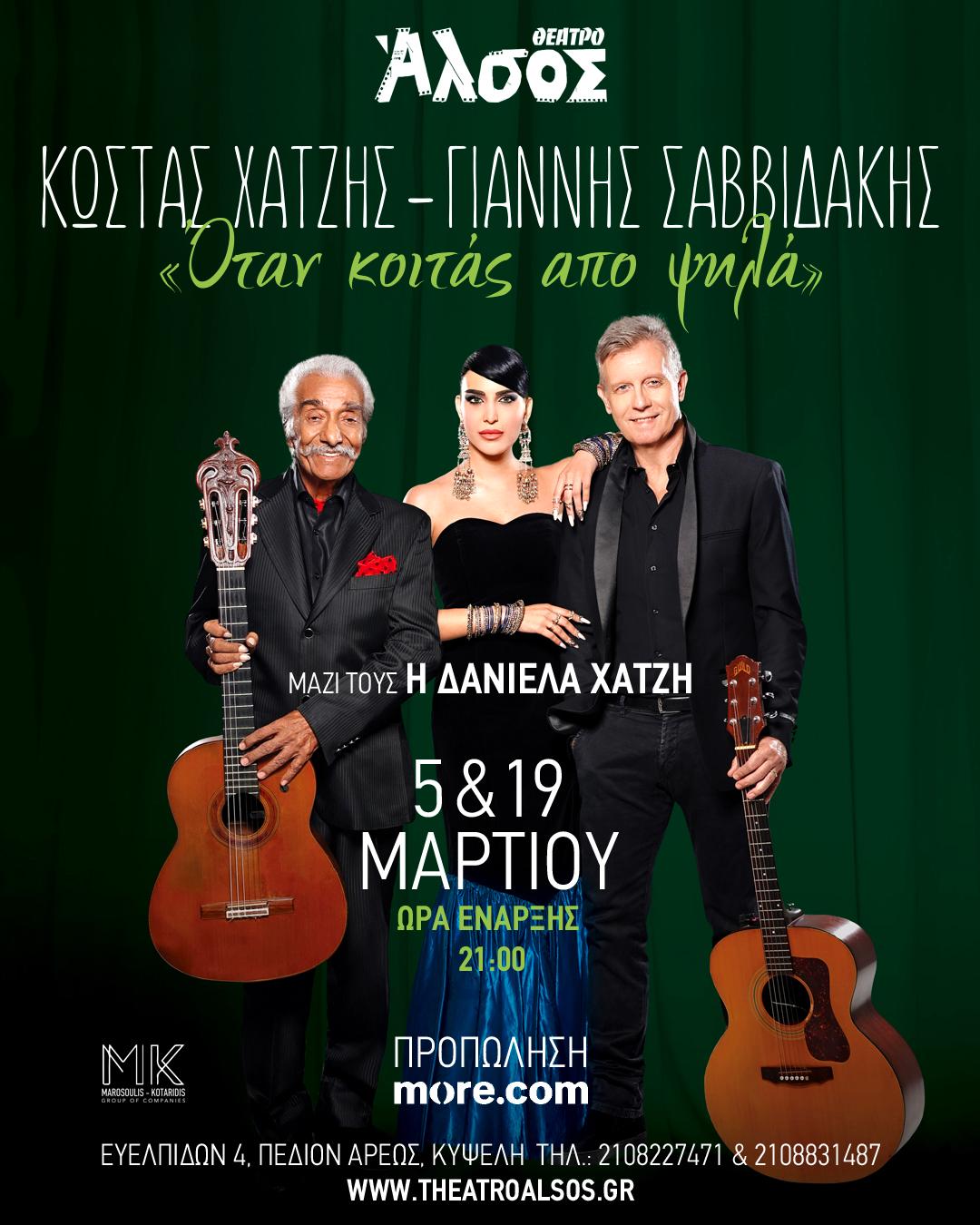 Ο σπουδαίος δημιουργός και πρωτοπόρος του κοινωνικού τραγουδιού Κώστας Χατζής συναντά στη σκηνή τον εξαιρετικό ερμηνευτή Γιάννη Σαββιδάκη για δύο μοναδικές παραστάσεις στο Θέατρο Άλσος, τις Τετάρτες 5 και 19 Μαρτίου.
