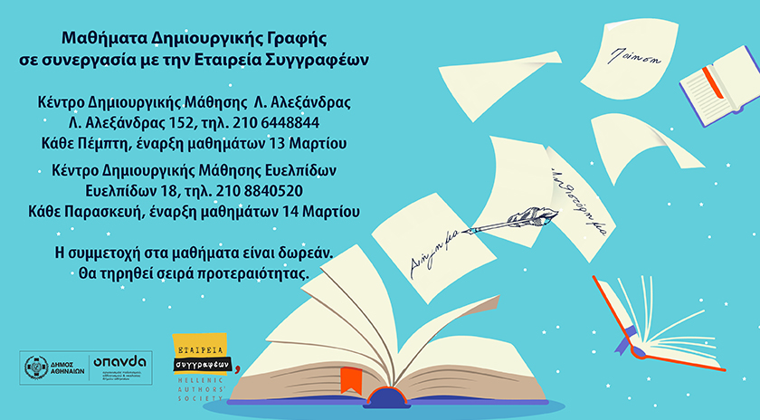 Ο Οργανισμός Πολιτισμού, Αθλητισμού και Νεολαίας Δήμου Αθηναίων (ΟΠΑΝΔΑ), στο πλαίσιο των πρωτοβουλιών που αναλαμβάνει για την ενίσχυση του βιβλίου και της φιλαναγνωσίας, και σε συνεργασία για πρώτη φορά με την Εταιρεία Συγγραφέων, διοργανώνει στα Κέντρα Δημιουργικής Μάθησης της Λεωφόρου Αλεξάνδρας και της Ευελπίδων Πρόγραμμα Δημιουργικής Γραφής, που περιλαμβάνει δύο κύκλους μαθημάτων.
