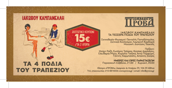 To Θέατρο ΠΡΟΒΑ προσφέρει στους φίλους του Theater Project 365 δύο εισιτήρια στην τιμή του ενός ( 15€ τα δύο άτομα), για να παρακολουθήσουν την παράσταση ΤΑ 4 ΠΟΔΙΑ ΤΟΥ ΤΡΑΠΕΖΙΟΥ την Παρασκευή 27/5 στις 21.00, το Σάββατο 28/5 στις 21.00 και την Κυριακή 29/5 στις 20.00