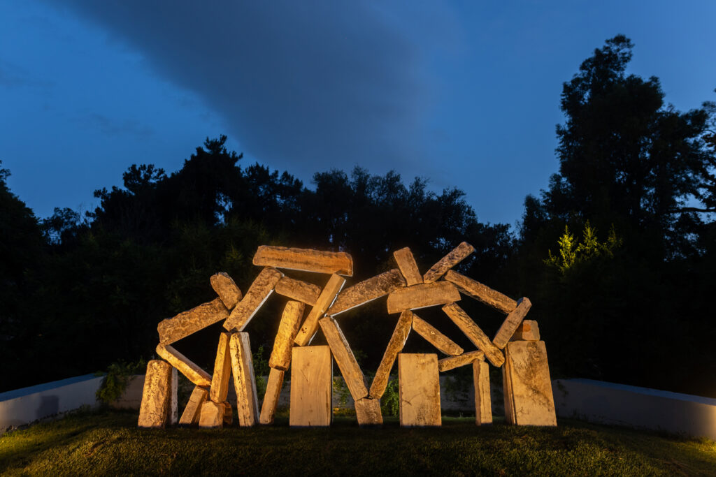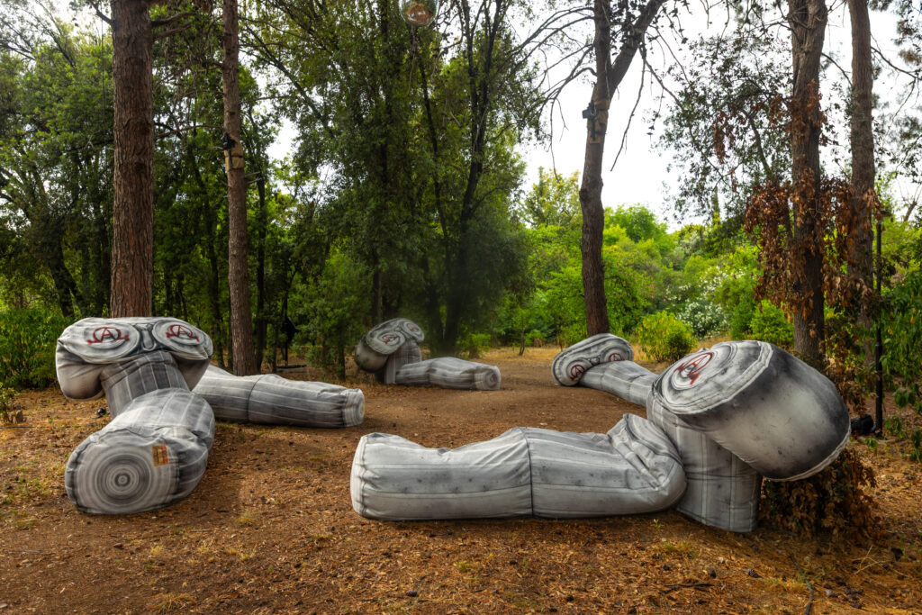 Τα έργα κατοικούν το Πεδίο του Άρεως, σαν να ήταν εκεί από πάντα. Ο Ανδρέας Αγγελιδάκης με την Αναρχαιολογική Αναπαράσταση (2025) φαντάζεται κίονες που μπορείς δίπλα τους να ξαποστάσεις, σε ένα ξέφωτο που δεν έχεις προσέξει ποτέ πριν, προτείνοντας μια αντιεραρχική queer αρχαιολογία. Ο Andreas Wannerstedtμε το Focus! (2024) σχολιάζει χιουμοριστικά την εμμονή μας να διαχωρίζουμε το αληθινό και το ψεύτικο, αλλά και το μάταιο της αντίστασης στις επιθυμίες μας, εκκινώντας από μια χρωματιστή προτομή του στωικού φιλοσόφου Χρύσιππου. Η Ναταλία Μαντά με το Mother (2023) μας φανερώνει ένα γλυπτό μιας μητέρας θεάς, που θα μπορούσε να έχει τώρα μόλις ανακαλυφθεί σε κάποια ανασκαφή αλλά και να έχει πέσει από κάποιον ιπτάμενο δίσκο, σαν μια αρχαιολογία του μέλλοντος, έτοιμη να κυοφορήσει και να χυμήξει ταυτόχρονα. Οι Joana Hadjithomas & Khalil Joreige με το Where Is My Mind? (2020), εμπνευσμένοι από τον Σεφέρη, μας ψιθυρίζουν ιστορίες αιώνων μέσα από μια ατελείωτη παρέλαση ακέφαλων και ασώματων ελληνιστικών αγαλμάτων και ψηφιακών στοιχείων, σε μια τελετή για την απώλεια, τη μνήμη και την ελευθερία. Η Έφη Γούση με το Tectonic Riders (2025) υφαίνει μια τελετή αναγέννησης σε ένα μεταποκαλυπτικό τοπίο, με νεαρά κορίτσια σαν άλλες αμαζόνες και τη μηχανή ως το γονιμοποιό στοιχείο να αναβιώνουν το τελετουργικό των ταυροκαθαψίων, ως φορείς ζωής και φλόγας. Οι The Callas / Λάκης & Άρης Ιωνάςμε το Punkthenon (2022) μας προσκαλούν να απολαύσουμε ειρωνικά το αιώνιο ελληνικό καλοκαίρι ξαπλωμένοι σε σεζλόνγκ πάνω σε έναν μικρό λόφο, ατενίζοντας τον σουρεαλιστικό Παρθενώνα τους, σε μια παγωμένη έκρηξη φτιαγμένη από τα μάρμαρα των πεζοδρομίων του κέντρου της Αθήνας, ως μια πανκ αρχαιολογία του τώρα, ενώ με το Beware of the Dogs (Προσοχή στους σκύλους, 2001) απεκδύονται τον ανθρώπινο εαυτό τους διακωμωδώντας την αδυναμία επικοινωνίας μεταξύ ανθρώπων και ζώων αλλά και μεταξύ των ίδιων των ανθρώπων.