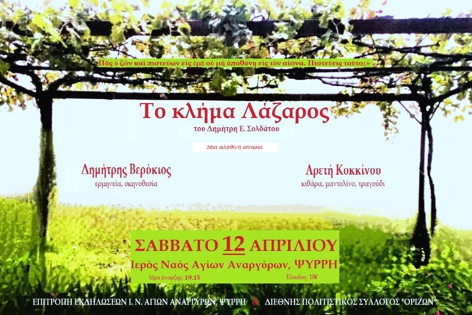 ΣΑΒΒΑΤΟ 12 ΑΠΡΙΛΙΟΥ, ΤΟΥ ΛΑΖΑΡΟΥ / ΩΡΑ: 19.15