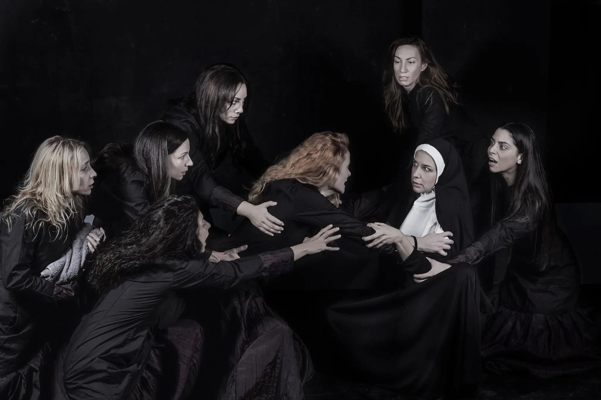 Η σκηνοθεσία ανήκει στον  Δημήτρη Καρατζιά. Με μεγάλη μαεστρία τοποθετεί τον πολυμελή θίασο στην μικρή σκηνή του θεάτρου. Τα κιβώτια, που είναι τα σκηνικά της παράστασης, δημιουργίες του Γιώργου Λυντζέρη, μετακινούνται διαρκώς από τις πρωταγωνίστριες, ανάλογα με τις ανάγκες της παράστασης. Στοιχεία λειτουργικά και όχι διακοσμητικά, που εντυπωσιάζουν μέσα στην αφαιρετική απλότητά τους. Σχηματίζουν σταυρούς και χωρίζουν την σκηνή σε δύο μικρότερες σκηνές. Ο Δημήτρης Καρατζιάς κάνει «βουτιά» στις ψυχές και στις ιστορίες όλων αυτών των γυναικών, καθώς επίσης και των τριών καλογριών –δεσμοφυλάκων τους, του ιερέα, του δασκάλου, του γιατρού και μας κοινωνεί το δράμα τους. Η μικρή σκηνή, οι μαύροι τοίχοι,  τα μακριά μαύρα ρούχα των γυναικών δημιουργούν έντονη την αίσθηση του εγκλεισμού. Έχει σεβαστεί το δυνατό, σκληρό, συγκινητικό και έντονα φορτισμένο κείμενο που έχει στα χέρια του.