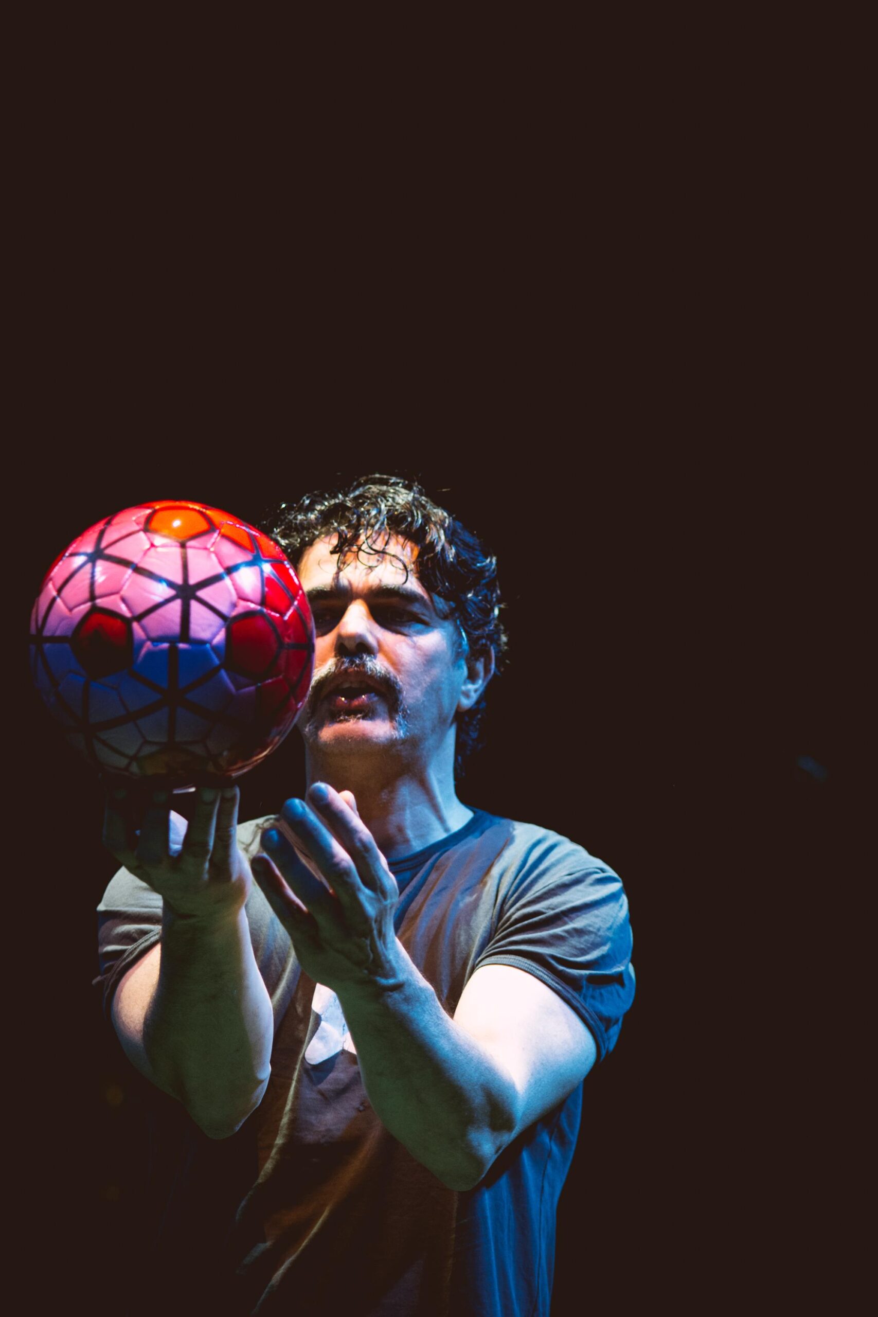 Το FOOTBALL είναι μια “σκληρή ματωμένη κωμωδία” , ένας καυστικός μονόλογος με πολύ χιούμορ, που αναλύει την ιστορία της ανθρωπότητας μέσα από την ιστορία του ποδοσφαίρου ,ξεκινώντας από το 1500 μ.Χ. Μιλάει για ένα αρχαίο ένστικτο του ανθρώπου να”κλωτσάει” και για μια άγρια ψυχή πουβρίσκεται θαμμένη μέσα μας και αναφέρει χαρακτηριστικά :